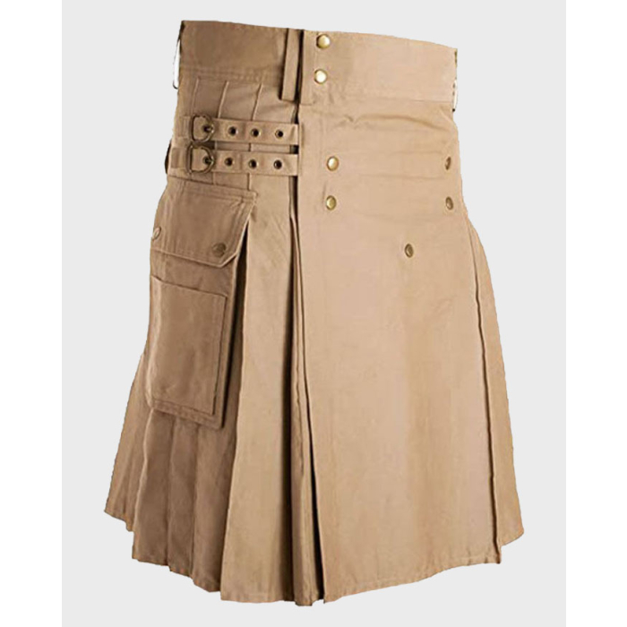 Each khaki utility kilt is carefully made with strong stitching and quality hardware to handle regular use. Adjustable waist straps ensure a secure and comfortable fit throughout the day.